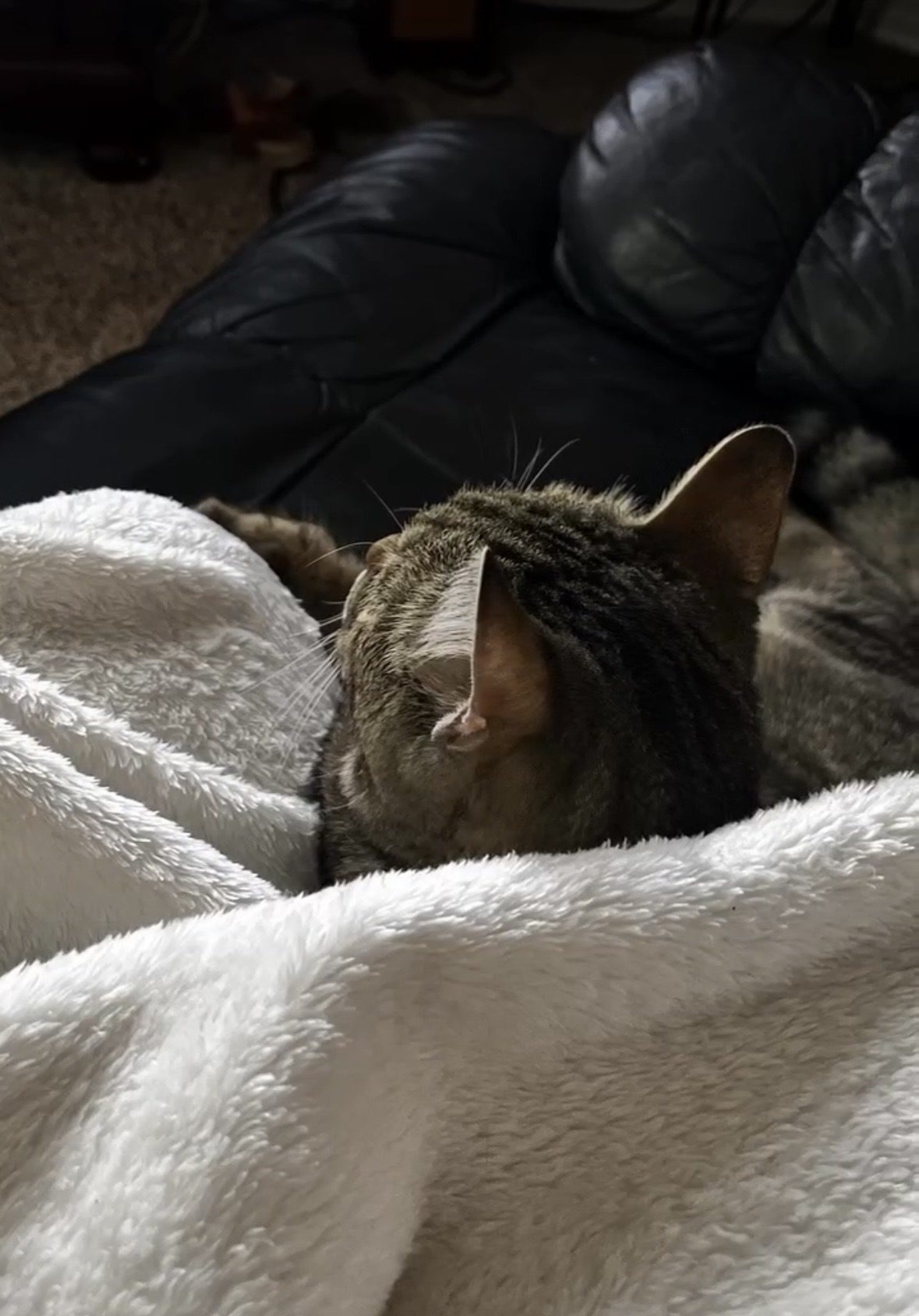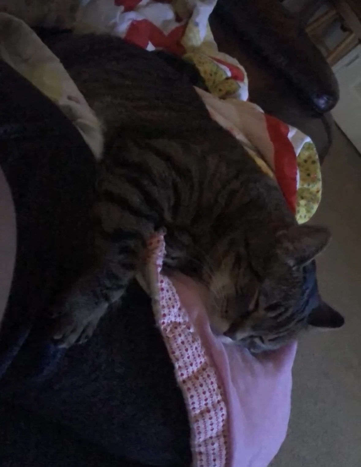 He also had his own little comforts, thanks to extended family who made sure he was included in every way. They gifted him quilts and pillows so he could enjoy the same cozy comforts we humans do. George treasured these items, curling up on them with the contentment of a cat who felt safe, warm, and adored.